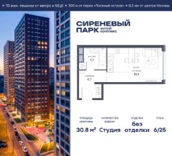 Продаётся просторная студия общей площадью 30.8 м² на 6 этаже в новом жилом комплексе "Сиреневый парк", расположенном в Восточном административном округе Москвы на улице Тагильская. Всего 10 минут ходьбы от станции метро "Бульвар Рокоссовского" и одноимённой платформы МЦК.