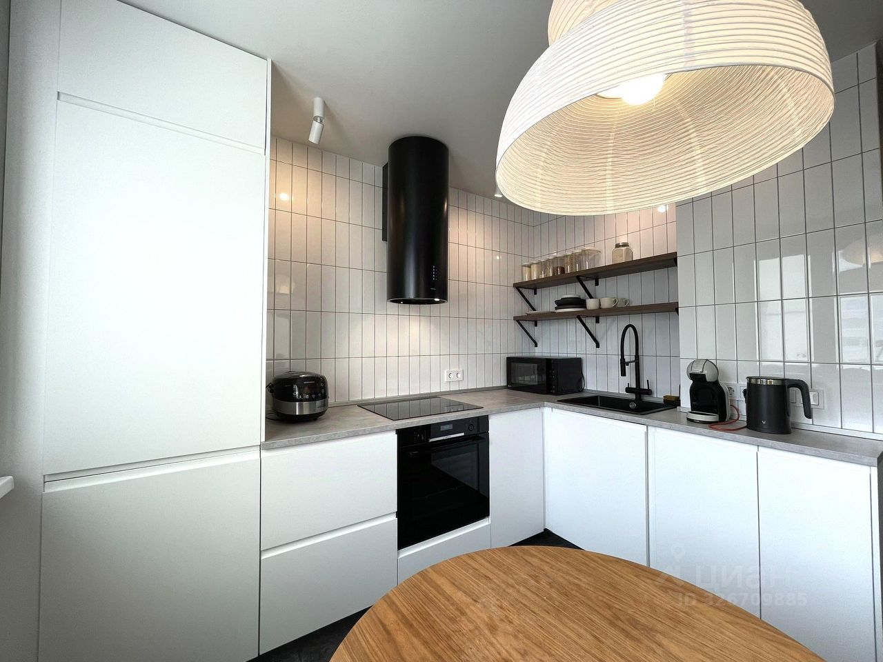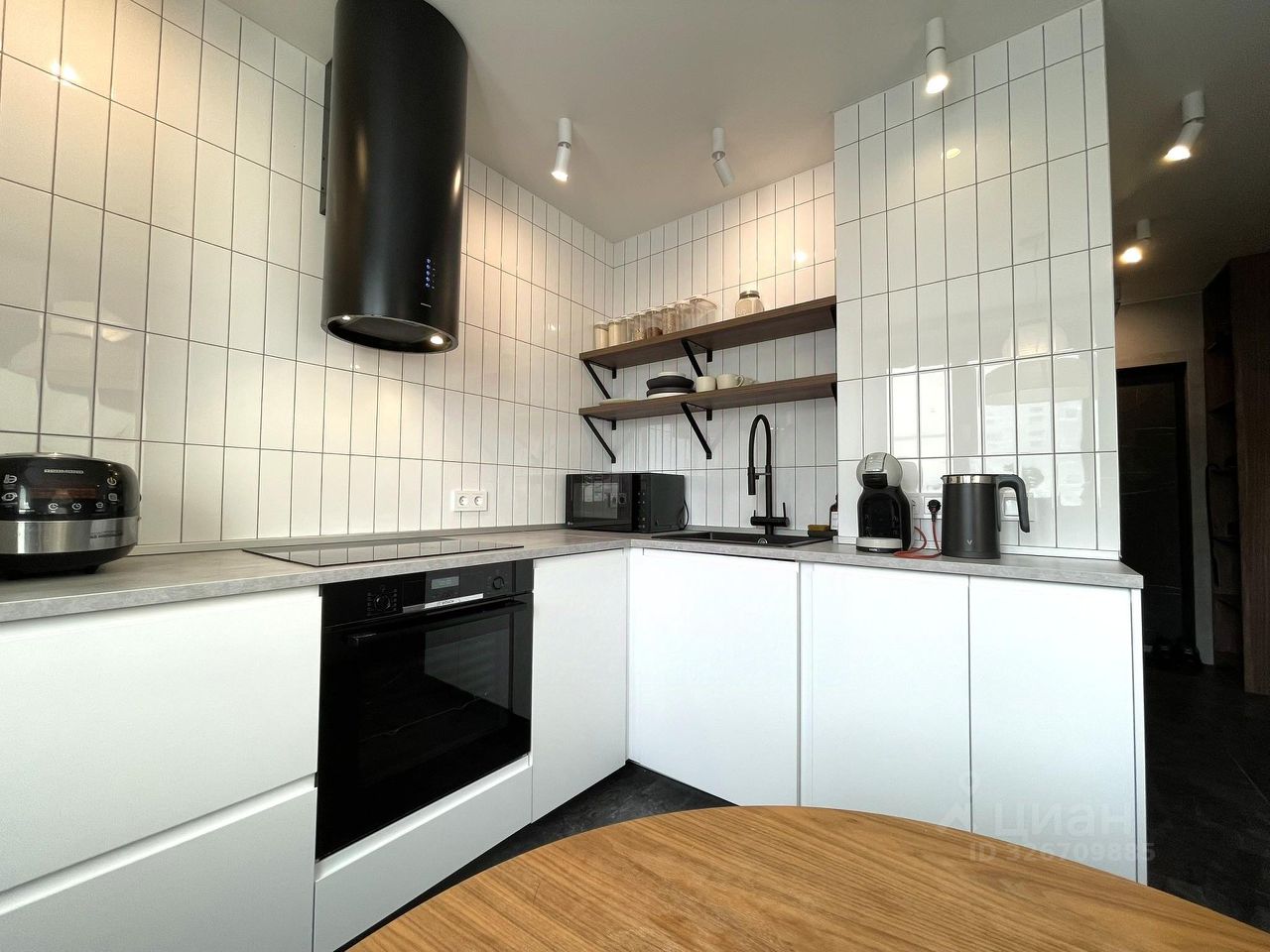Кухня площадью 8,2 кв. м оборудована встроенным кухонным гарнитуром со встроенной бытовой техникой: посудомоечная машина, варочная панель, духовой шкаф, встроенный холодильник.