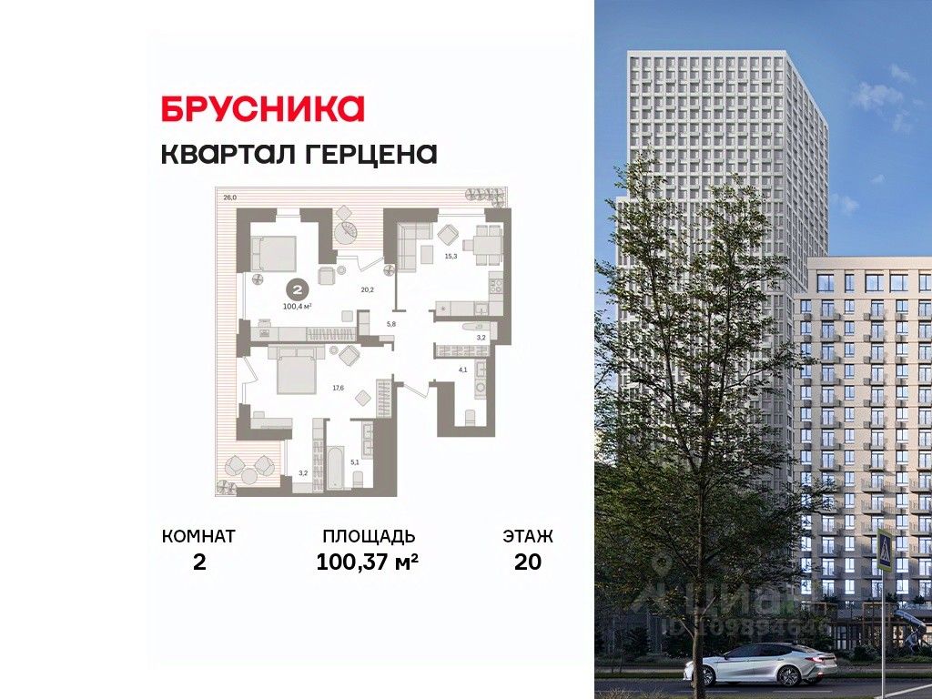 Квартира с кухней-гостиной и двумя спальнями в Квартале Герцена. Особенности планировки: мастер-спальня, окна на две стороны, предчистовая отделка.