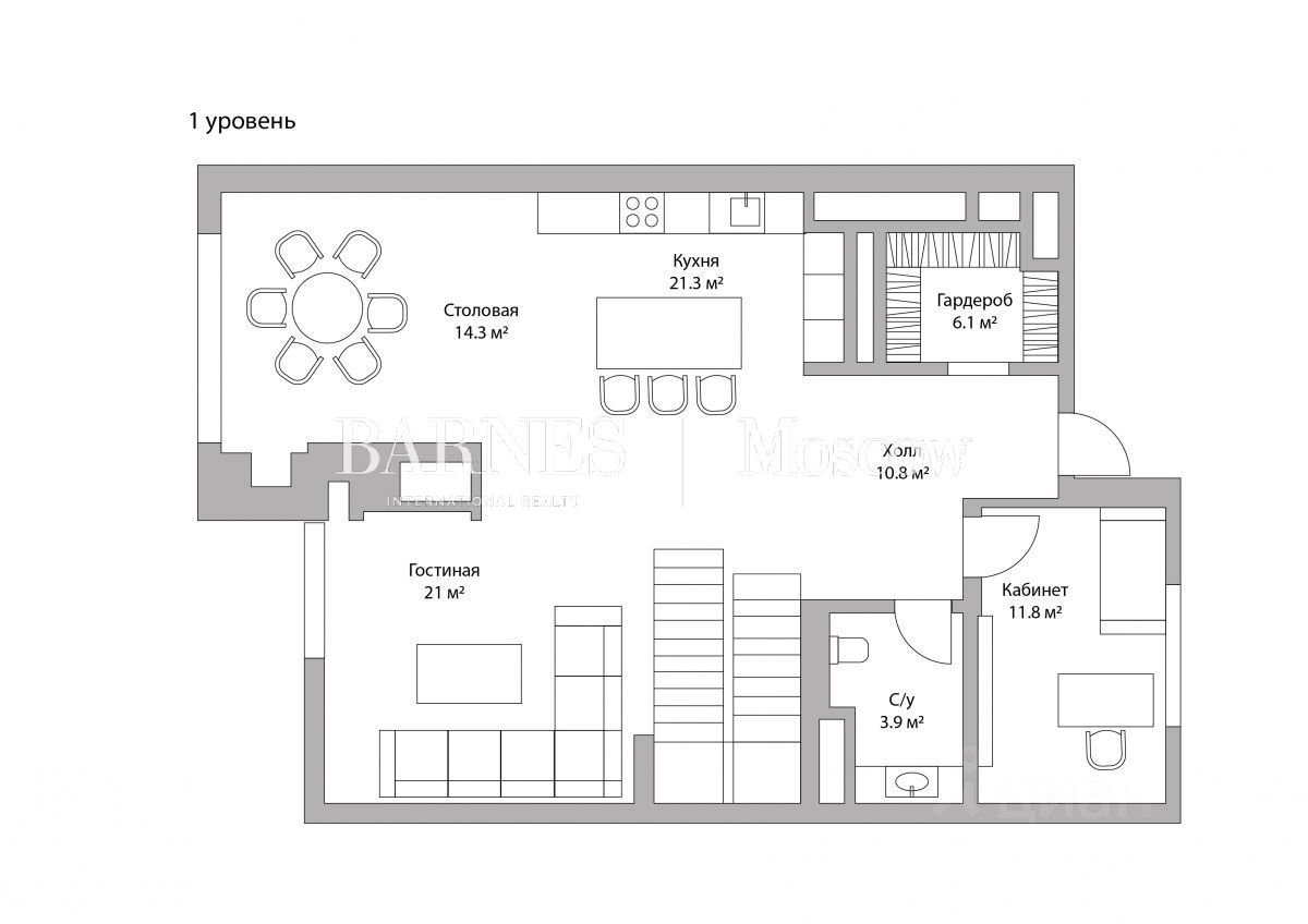 1 уровень - просторная гостиная с дровяным камином и зонами столовой и кухни, кабинет, гостевой санузел, холл с гардеробной;