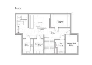 цоколь - комната отдыха с тренажерным залом, техническая кухня, постирочная, санузел, кладовая, котельная.