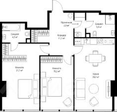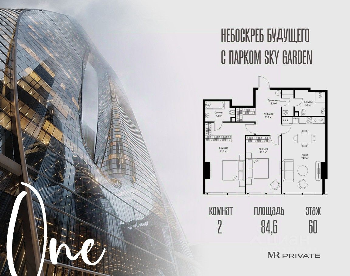 В продаже 2-комнатная квартира площадью 84.60 м² на 60-м этаже.