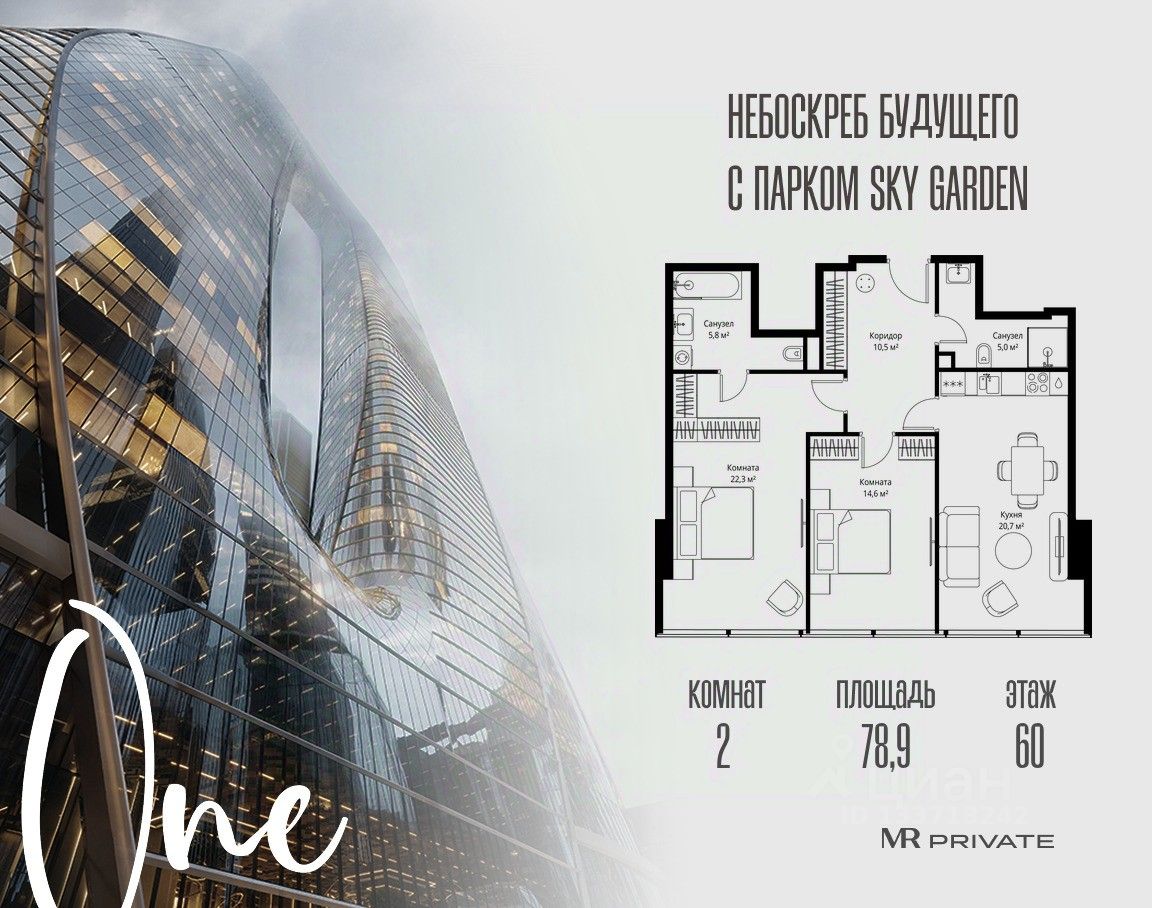 В продаже 2-комнатная квартира площадью 78.90 м² на 60-м этаже.