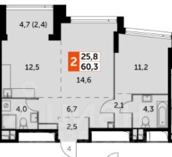 Общая площадь квартиры -60,3 кв.м. Мастер-спальня (11,2 кв.м.) с личным санузлом (4,3 кв.м.) и гардеробной зоной. Кухня (12,5 кв.м.) , гостиная (14,6 кв.м.). Просторная лоджия -выход из кухни. Гостевой санузел (4 кв.м.) можно оборудовать под постирочную.