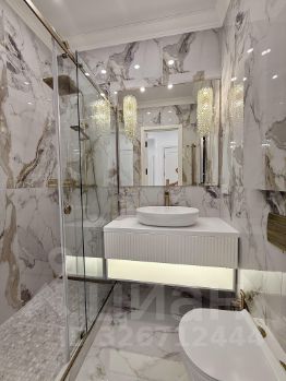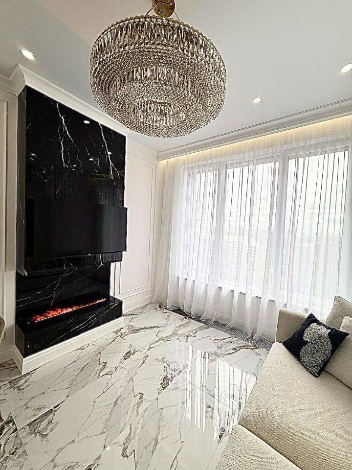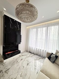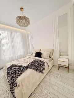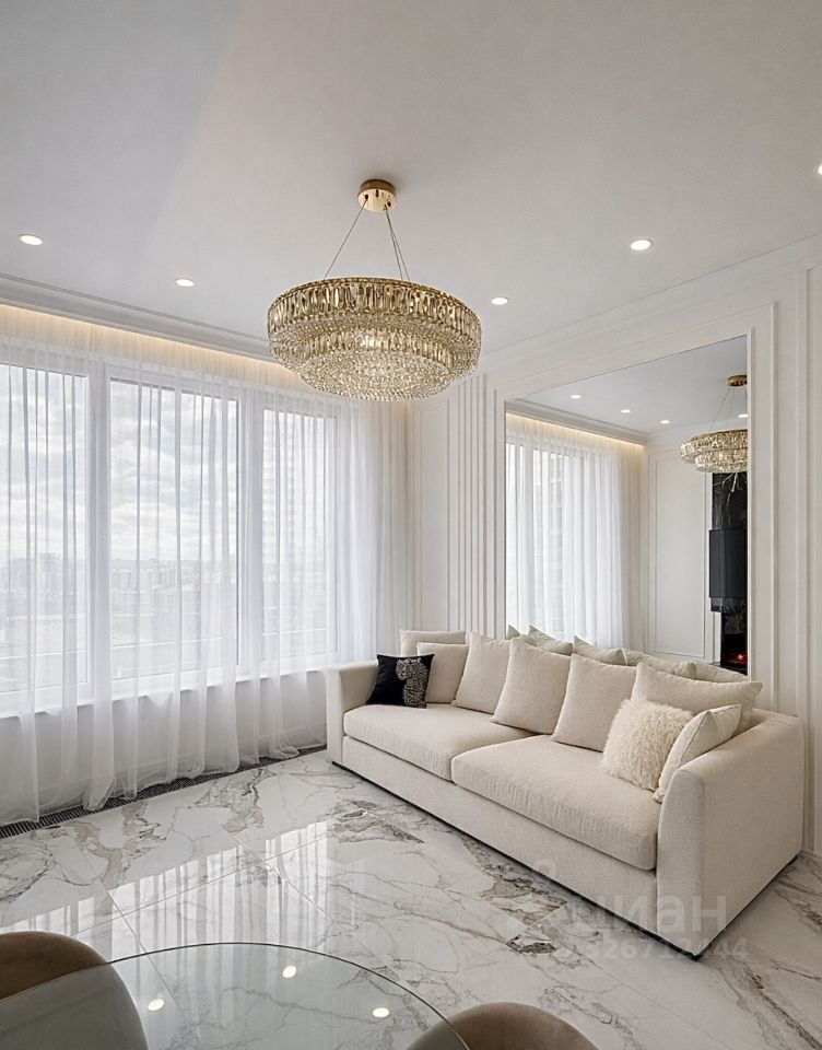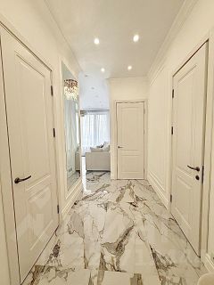 Интерьер квартиры выполнен в светлой современной классике с использованием качественных дорогостоящих материалов: декоративные стеновые панели, мраморной керамогранит, паркет, система освещения, высокие нестандартные двери, зеркальное оформление. Продуманная планировка, гармоничные цвета и аккуратные детали создают ощущение уюта и комфорта.