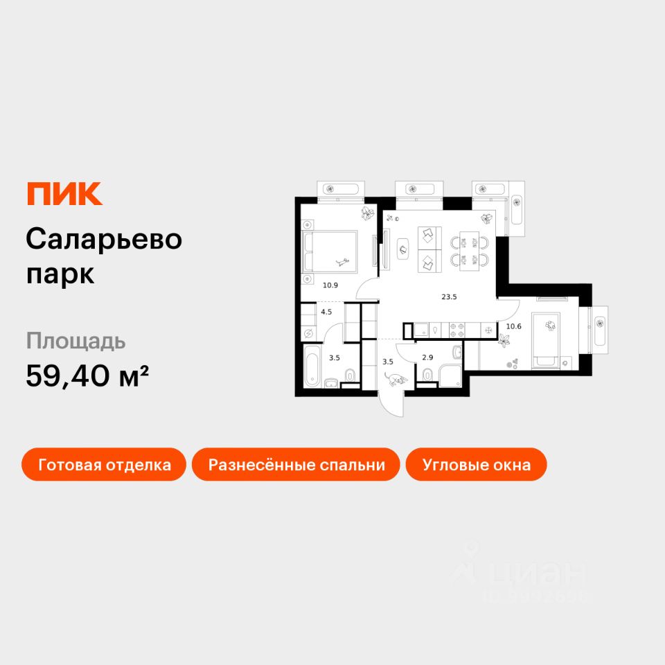 Продаётся 2-комн. квартира площадью 59,4 кв.м на 13 этаже 18 этажного дома (Корпус 74.6, Секция 6) проекта ПИК Саларьево парк. Светлый просторный подъезд на уровне земли, функциональная планировка, большие окна, c отделкой.