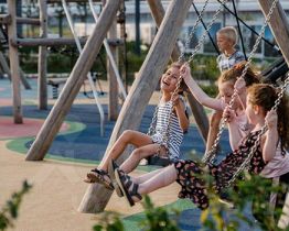 Все корпуса в квартале гармонично сочетаются, образуя единую городскую среду. Между собой их объединяет невысокая этажность и натуральная цветовая гамма. Здесь приятно гулять и проводить время на улице всей семьёй.