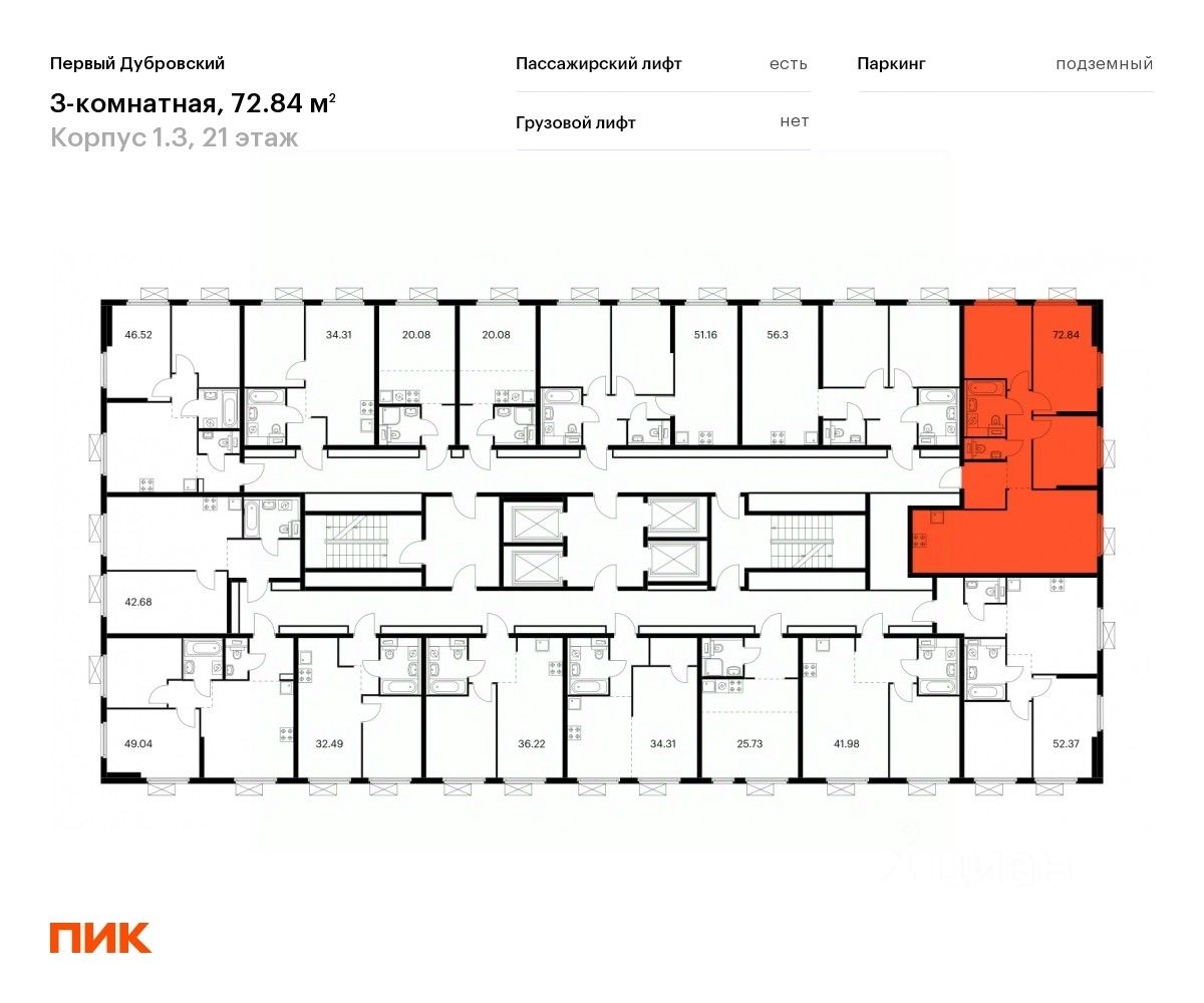 Продаётся 3-комн. квартира площадью 72,84 кв.м на 21 этаже 33 этажного дома (Корпус 1.3, Секция 1) проекта ПИК Первый Дубровский. Светлый просторный подъезд на уровне земли, функциональная планировка, большие окна, c отделкой.