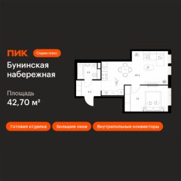 Продаётся 1-комн. квартира площадью 42,7 кв.м на 3 этаже 16 этажного дома (Корпус 2.6/1.3, Секция 3) проекта ПИК Бунинская набережная. Светлый просторный подъезд на уровне земли, функциональная планировка, большие окна, c отделкой.