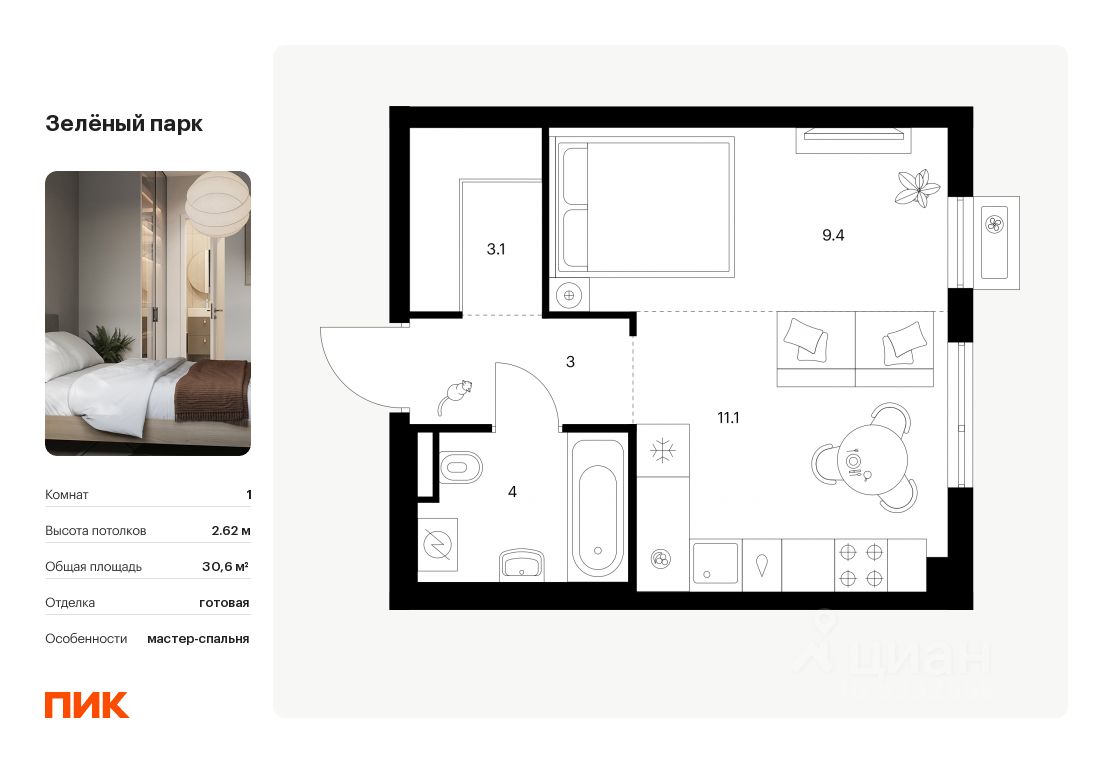 Продаётся 1-комн. квартира площадью 30,6 кв.м на 11 этаже 13 этажного дома (Корпус 5.3, Секция 3) проекта ПИК Зелёный парк. Светлый просторный подъезд на уровне земли, функциональная планировка, большие окна, c отделкой.