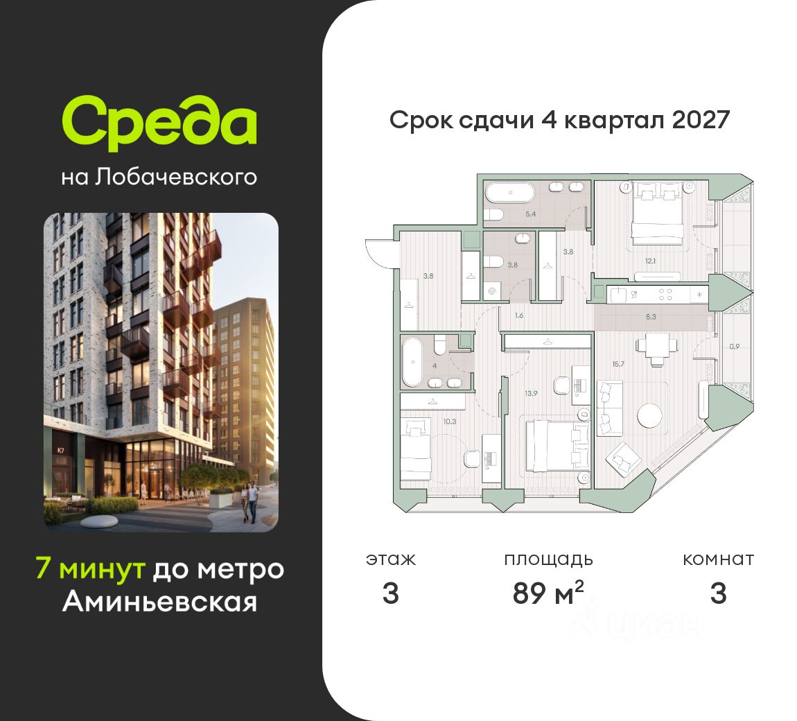 Продаётся 3-комнатная квартира общей площадью 89 кв.м. без отделки. Квартира расположена на 3 этаже корпуса 5.7 в жилом комплексе бизнес-класса "Среда на Лобачевского" в пешей доступности от метро "Аминьевская".