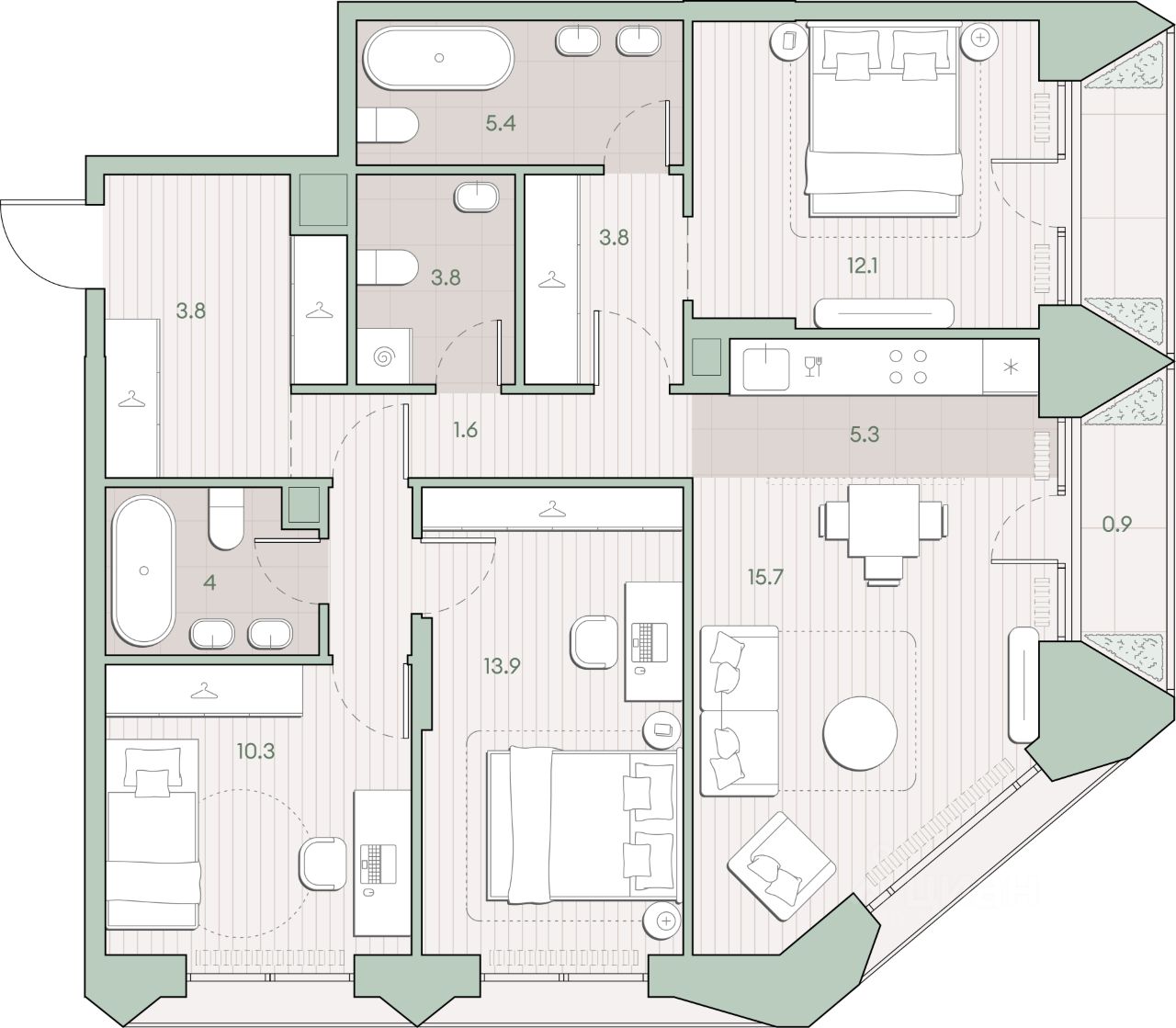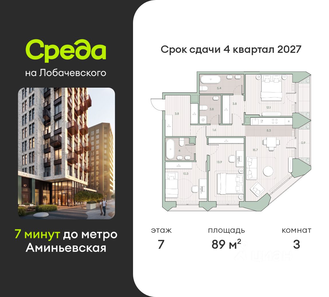 Продаётся 3-комнатная квартира общей площадью 89 кв.м. без отделки. Квартира расположена на 7 этаже корпуса 5.7 в жилом комплексе бизнес-класса "Среда на Лобачевского" в пешей доступности от метро "Аминьевская".