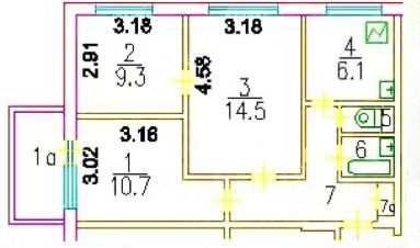 Планировка: изолированная комната 10,7 кв. м и две смежные 14,5 + 9,3 кв. м.