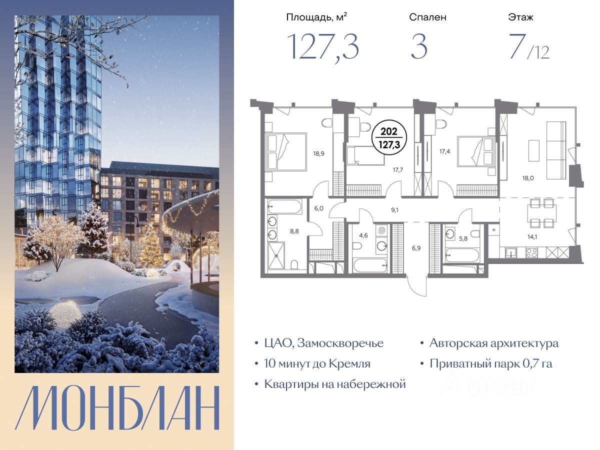 В элитном жилом комплексе "Монблан" на Шлюзовой набережной в Замоскворечье напрямую от девелопера ГК "Галс-Девелопмент" представлена 3-комнатная квартира квартира на 7 этаже общей площадью 127.30 м².