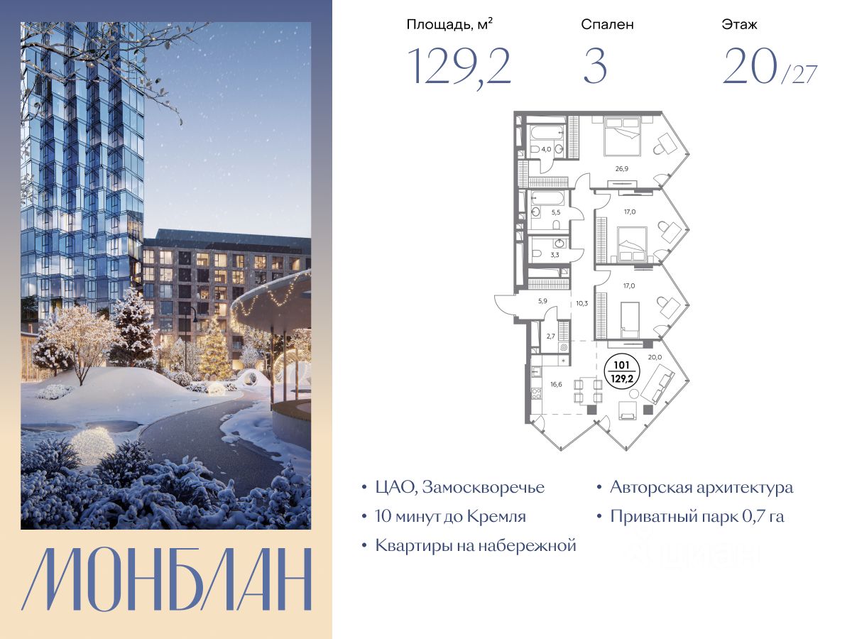 В элитном жилом комплексе "Монблан" на Шлюзовой набережной в Замоскворечье напрямую от девелопера ГК "Галс-Девелопмент" представлена 3-комнатная квартира квартира на 20 этаже общей площадью 129.20 м².
