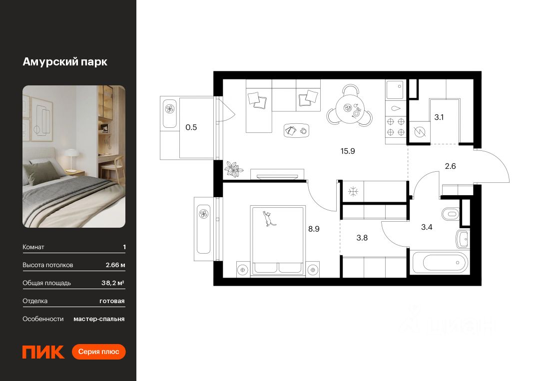 Продаётся 1-комн. квартира площадью 38,2 кв.м на 10 этаже 19 этажного дома (Корпус 4.4, Секция 4) проекта ПИК Амурский парк. Светлый просторный подъезд на уровне земли, функциональная планировка, большие окна, c отделкой.