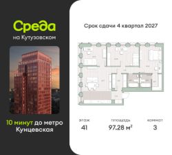 Продаётся 3-комнатная квартира общей площадью 97.28 кв.м. с отделкой white box. Квартира расположена на 41 этаже корпуса 4.1 в жилом комплексе бизнес-класса "Среда на Кутузовском" в пешей доступности от метро "Кунцевская".