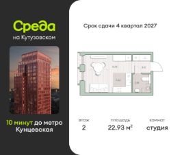 Продаётся студия общей площадью 22.93 кв.м. с отделкой white box. Квартира расположена на 2 этаже корпуса 4.1 в жилом комплексе бизнес-класса "Среда на Кутузовском" в пешей доступности от метро "Кунцевская".