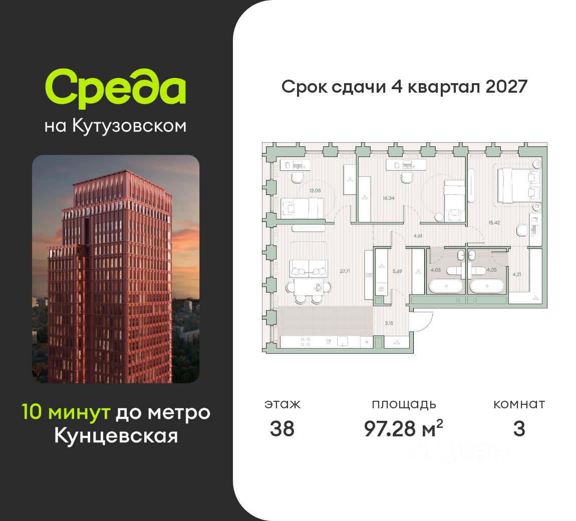 Продаётся 3-комнатная квартира общей площадью 97.28 кв.м. с отделкой white box. Квартира расположена на 38 этаже корпуса 4.1 в жилом комплексе бизнес-класса "Среда на Кутузовском" в пешей доступности от метро "Кунцевская".