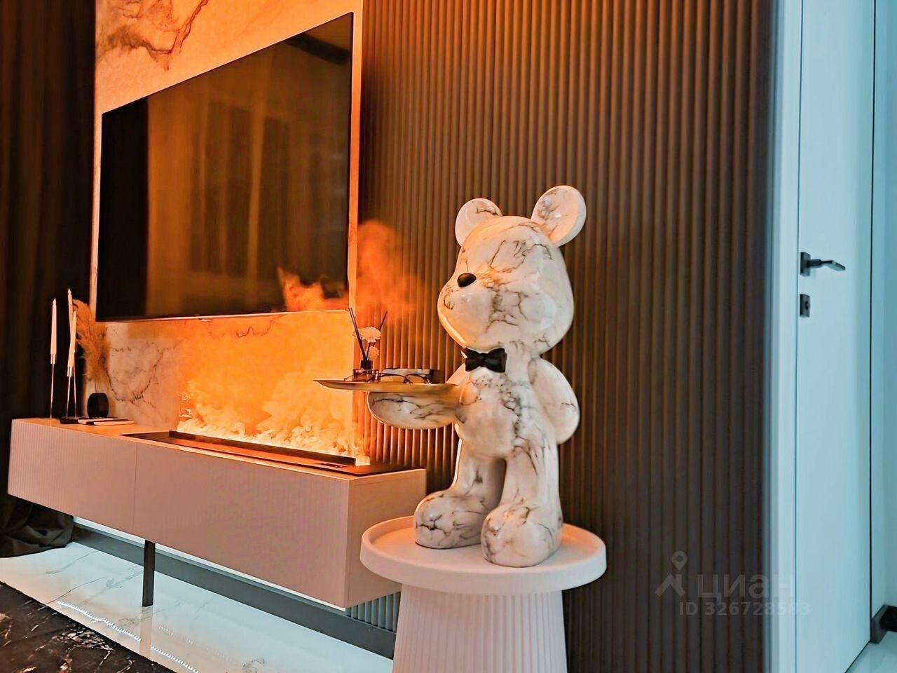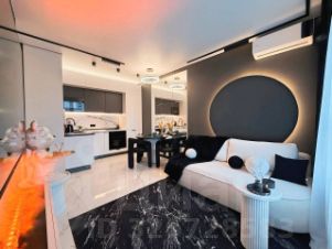 -На полу керамогранит 120х60, в спальне ламинат, влагостойкий с повышенной прочностью. Тёплые полы. Все стены покрыты моющейся краской. Двери скрытого монтажа. Экополимерные плинтуса. Стеновые панели. Необычное дизайнерское освещение во всей квартире. Парящий потолок