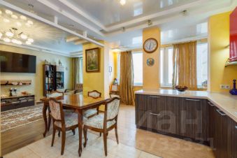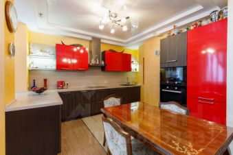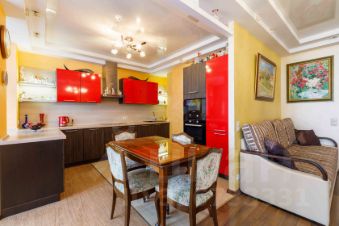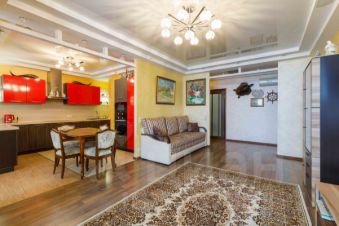 Кухня-Гостиная укомплектована необходимой мебелью и встроенной современной техникой Bosch (включая духовку и микроволновую печь, посудомоечную машину, варочную поверхность, холодильник). Вид из окон гостиной в сквер с детской площадкой, далее 1-й Хорошевский проезд.