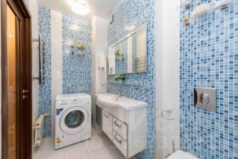Просторный санузел спроектирован с учетом наличия душевой кабины. Имеется гардеробная.