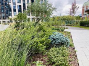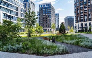 Закрытая территория с роскошным ландшафтным дизайном и современными зонами ожидания.