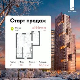 Старт продаж! Продаётся 2-комнатная квартира от застройщика ГК "КОРТРОС" в жилом комплексе бизнес-класса ULTIMAcity. Квартира расположена на 14 этаже 52 этажного корпуса 2. Общая площадь 68,85 м². Без отделки.