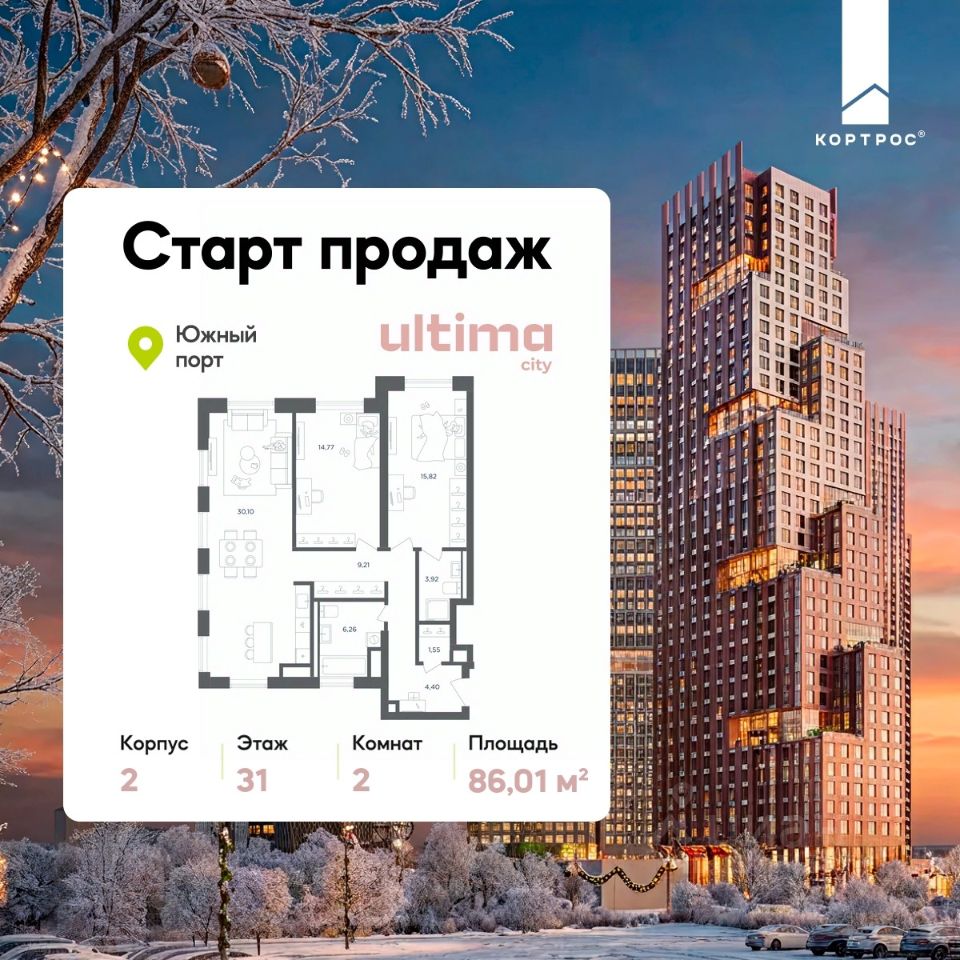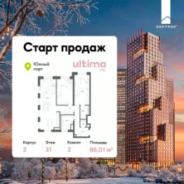 Старт продаж! Продаётся 2-комнатная квартира от застройщика ГК "КОРТРОС" в жилом комплексе бизнес-класса ULTIMAcity. Квартира расположена на 31 этаже 52 этажного корпуса 2. Общая площадь 86,01 м². Без отделки.