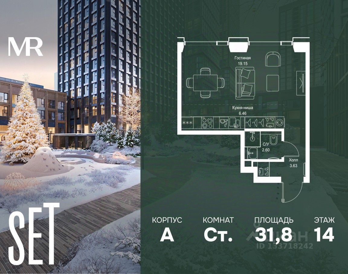 В ЖК Сет продается студия площадью 31.84 м², расположенная в корпусе А, на 14 этаже 52 этажного дома.