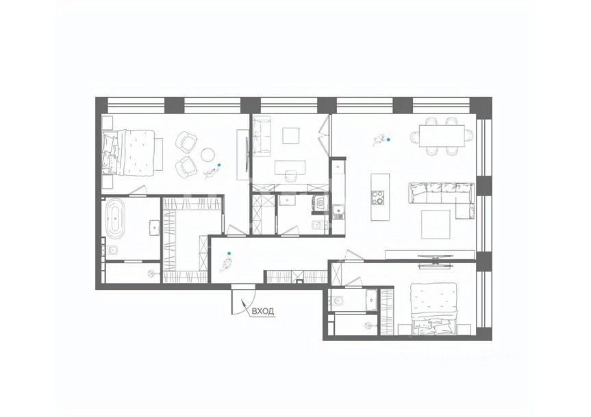 Планировка: кухня-гостиная, спальня с санузлом, спальня с гардеробной и санузлом, кабинет, гостевой санузел, прихожая.