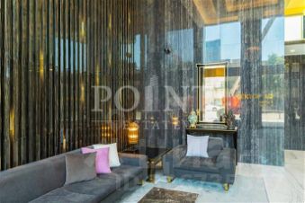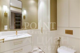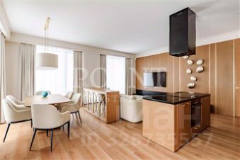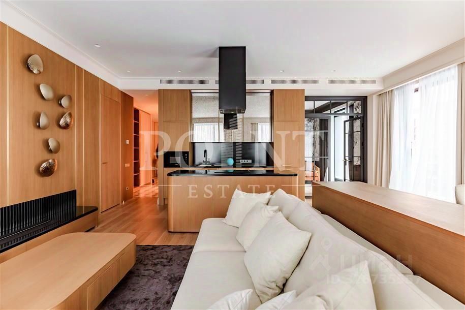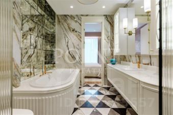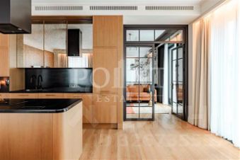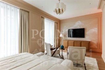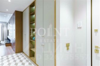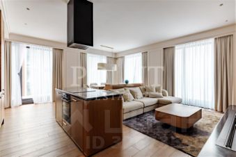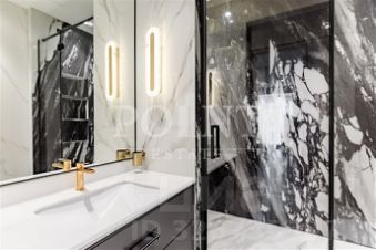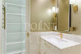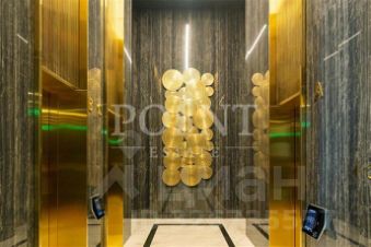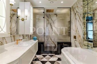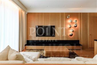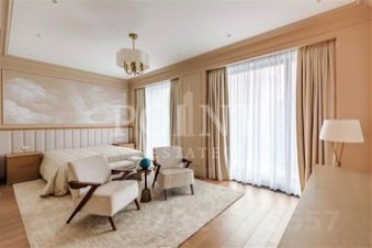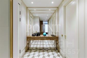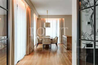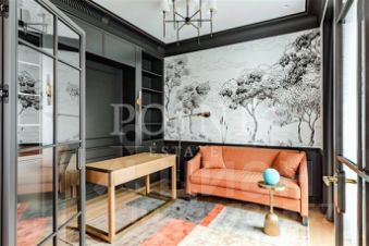 Для отделки использованы исключительно высококачественные материалы мирового уровня: на полу в жилых зонах уложена инженерная доска, в санузлах премиальный итальянский керамогранит, а в прихожей итальянская плитка. Стены декорированы уникальными ручными обоями ведущих европейских брендов Fresq, GEO.44, Arte, потолки представляют собой изящные подвесные конструкции с лепниной ручной работы. Интерьер в санузлах дополняют предметы сантехники от известных производителей Villeroy & Boch (Германия), Giulnig (Италия), Tres (Испания). Вся корпусная мебель, шкафы, стеновые панели и двери изготовлены индивидуально под заказ специально для данной квартиры. Для поддержания идеального микроклимата установлен современный климатический комплекс с фанкойлами производства японской компании DAIKON. Консьерж.