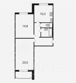 Общая площадь квартиры — 59,1 кв. м, две просторные комнаив, кухня — 10 кв. м.