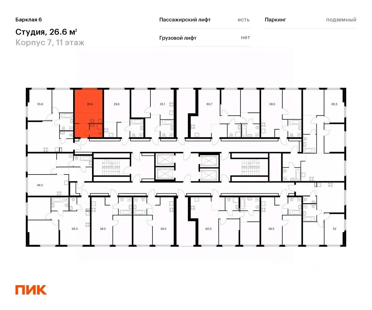 Продаётся квартира-студия площадью 26,6 кв.м на 11 этаже 32 этажного дома (Корпус 7, Секция 2) проекта ПИК Барклая 6. Светлый просторный подъезд на уровне земли, функциональная планировка, большие окна, предчистовая отделка.