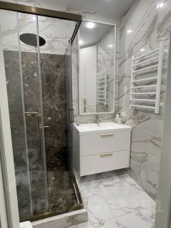 В квартире современный и качественный евроремонт, много света! Все продумано для комфортной жизни, использованы только качественные и дорогие материалы. Удобная кухня-гостиная, оснащена всей необходимой техникой. Просторная спальня правильной формы с вместительной гардеробной и кондиционером Mitsubishi . В санузле установлена просторная современная душевая, шкаф, раковина с тумбой и гигиенический душ Grocenberg. Вся сантехника скрытого монтажа, просторная прихожая.