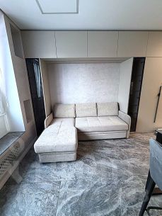 угловой диван, система шкафов ( для хранения), установлен кондиционер/ сан узел совмещенный с душевой кабиной.