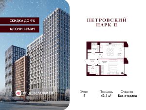 Продаётся 1-комнатная квартира 43.1 кв.м. в ЖК "Петровский парк II" на 5-м этаже 19 этажного дома.