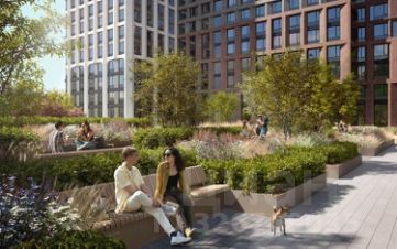 Внутренний двор комплекса - это отдельный мир, закрытый от машин и городского шума. Ландшафтный дизайн отсылает к регулярным дворцовым садам: геометрия аллей, зелёные "кабинеты", цветники и камерные зоны отдыха создают разные сценарии для повседневной жизни. Здесь органично соседствуют детские игровые пространства, плейхаб, спортивные зоны и тихие места для отдыха.