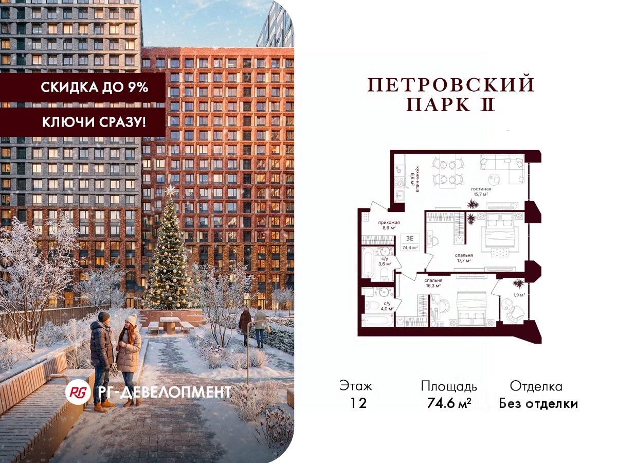 Продаётся 2-комнатная квартира 74.6 кв.м. в ЖК "Петровский парк II" на 12-м этаже 15 этажного дома.