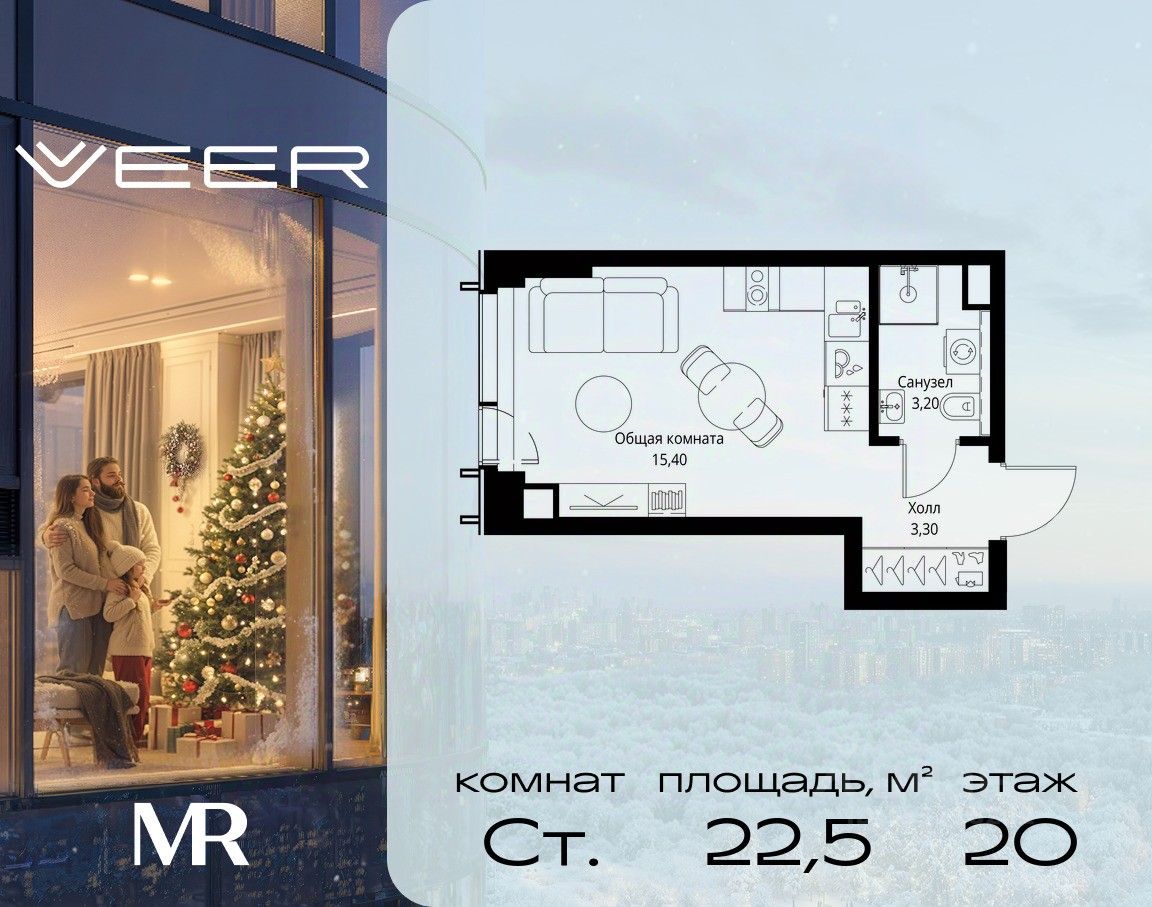 Продаётся студия общей площадью 22.50 м² без отделки в ЖК VEER на 20-м этаже 59 этажного дома.