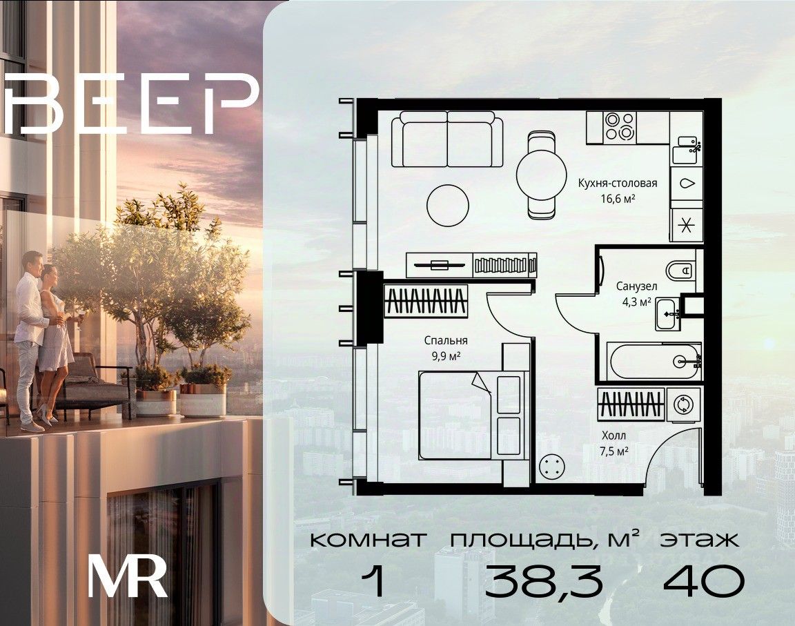 Продаётся 1-комнатная квартира общей площадью 38.30 м² без отделки в ЖК Веер на 40-м этаже 59 этажного дома.