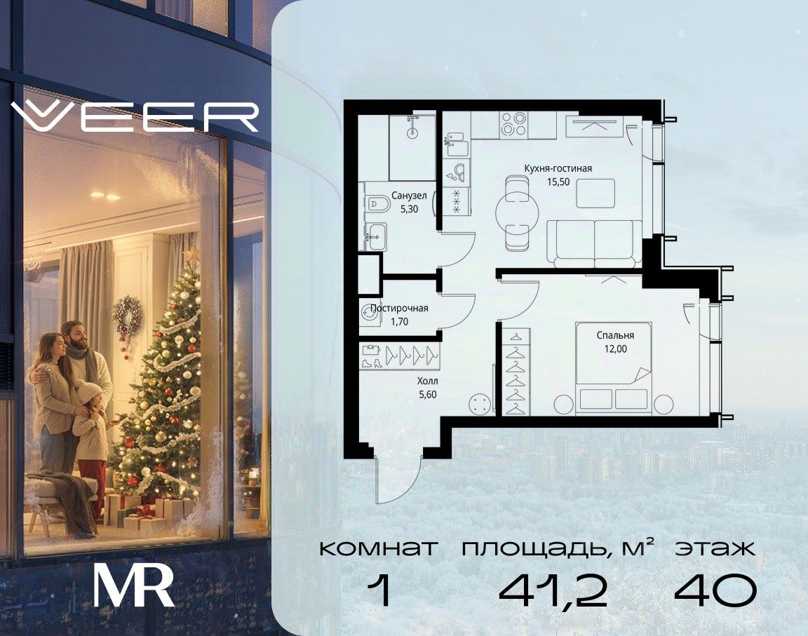 Продаётся 1-комнатная квартира общей площадью 41.20 м² без отделки в ЖК Веер на 40-м этаже 59 этажного дома.