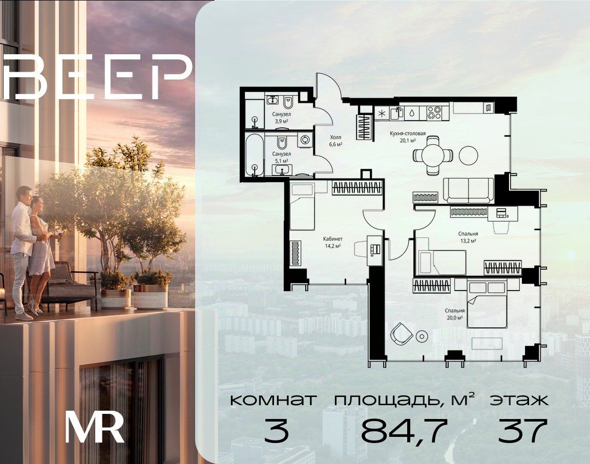 Продаётся 3-комнатная квартира общей площадью 84.70 м² без отделки в ЖК Веер на 37-м этаже 59 этажного дома.