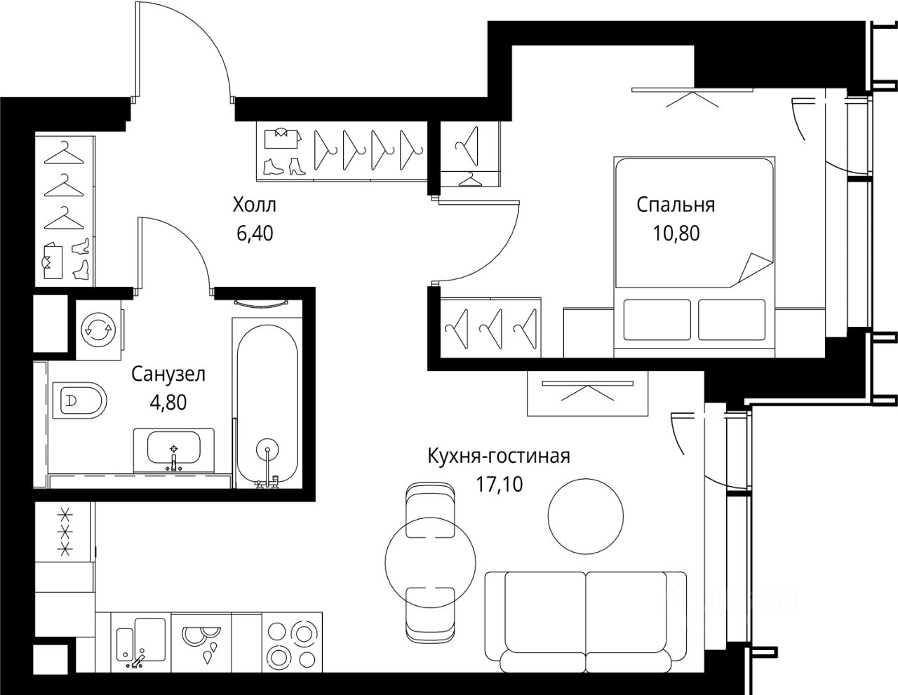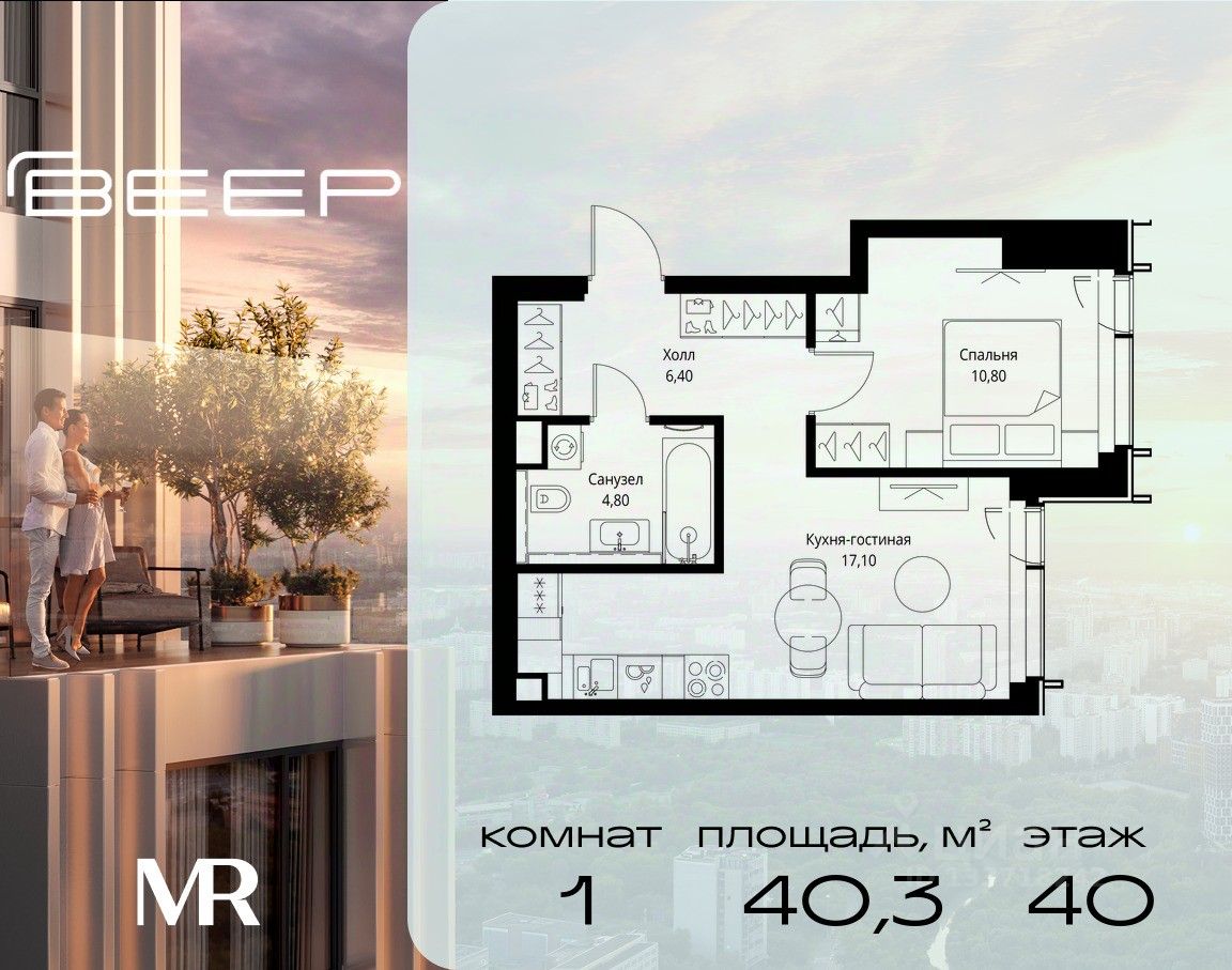 Продаётся 1-комнатная квартира общей площадью 40.30 м² без отделки в ЖК Веер на 40-м этаже 59 этажного дома.
