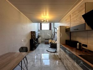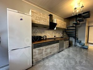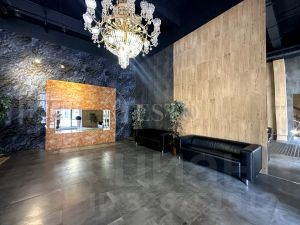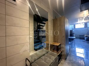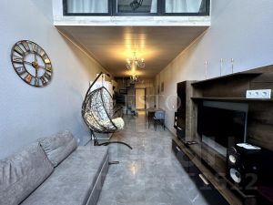 Войдя в апартаменты, мы попадаем в прихожую (4м²) в которой расположен гостевой сан. узел (1.7м²), шкаф для верхней одежды, пуфик и лестница на верхние этажи. Далее мы попадаем в кухню (10м²) с обеденной зоной. На кухне, установлен встроенный гарнитур который полностью укомплектован техникой. Варочная панель, вытяжка, посудомоечная машина, холодильник, микроволновая печь, чайник и вся необходимая посуда. Обеденная зона представляет из себя большой стол и 3 стула. Далее мы попадаем в гостиную (13м²), в которой располагается большой диван с зоной TV. Изюминкой на торте является второй свет, расположенный над зоной отдыха в гостиной, и создает впечатление будто вы находитесь не в квартире, а в загородном доме.