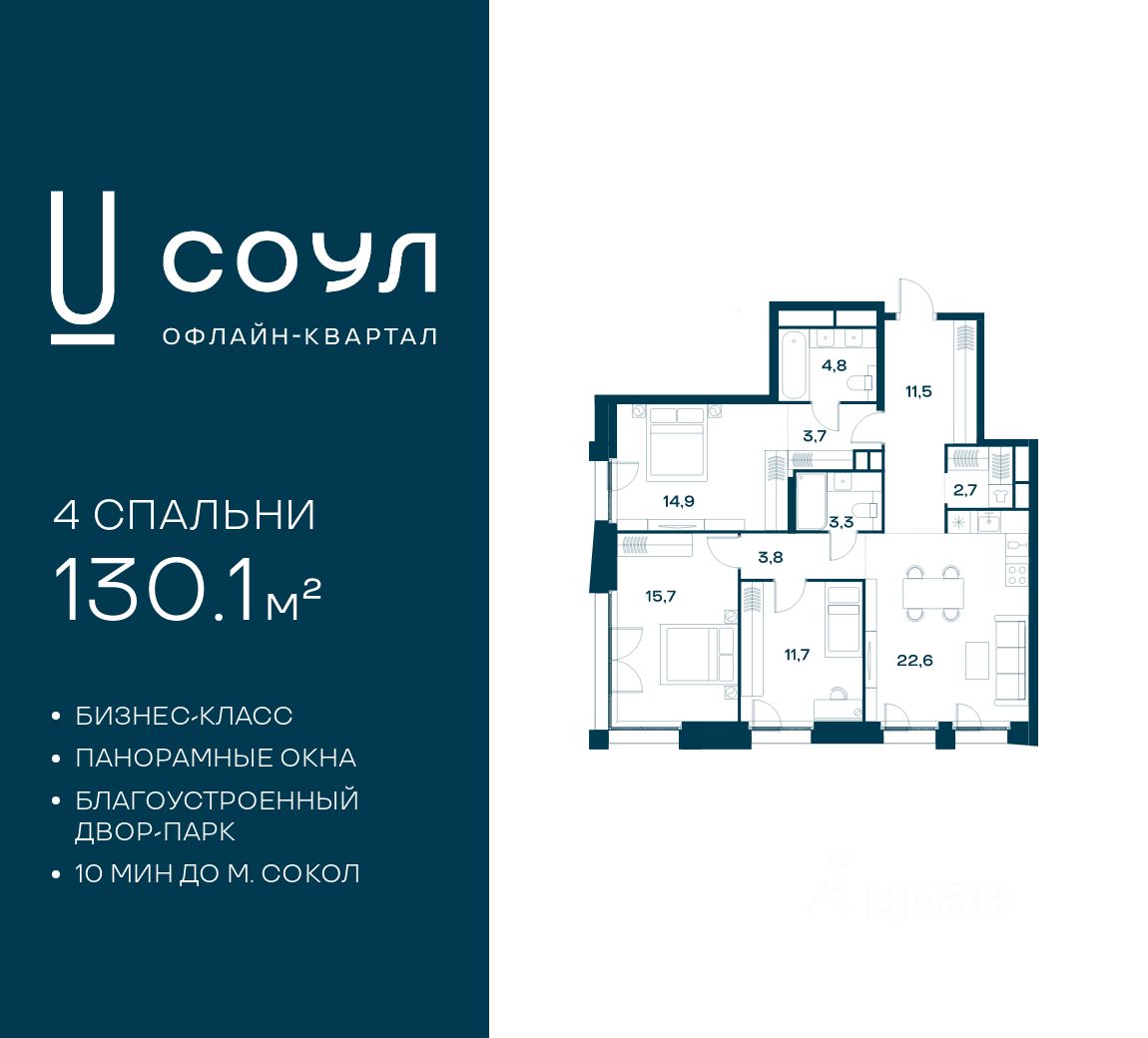 Продается 4-к. квартира номер 252 общей площадью 130.1 кв.м. на 21-м этаже 21 этажного дома, Корпус 1. С предчистовой отделкой.