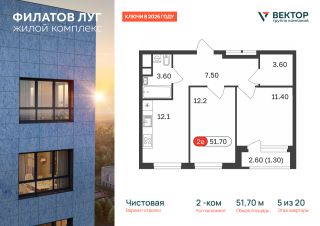 Продается 2-комн. квартира площадью 51,7 кв.м на 5 этаже 20 этажного дома в ЖК "Филатов Луг" от федерального девелопера ГК "Вектор".