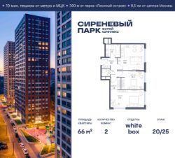 Продаётся просторная 2-комнатная квартира общей площадью 66 м² на 20 этаже в новом жилом комплексе "Сиреневый парк", расположенном в Восточном административном округе Москвы на улице Тагильская. Всего 10 минут ходьбы от станции метро "Бульвар Рокоссовского" и одноимённой платформы МЦК.