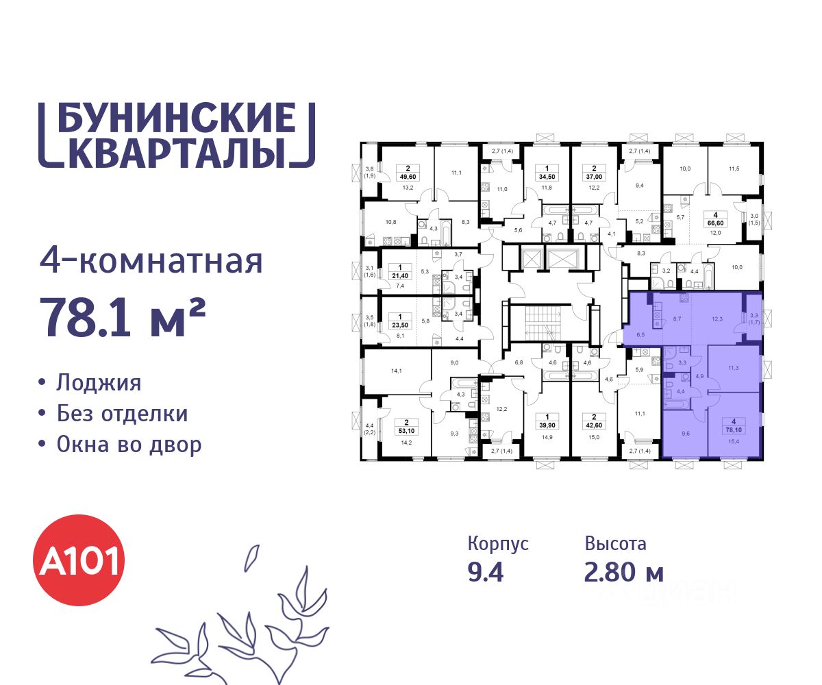 Продается четырехкомнатная квартира 999 в новостройке ЖК "Бунинские кварталы" по адресу Москва, ТиНАО, Новомосковский АО, Сосенское С/П, жилой комплекс Бунинские Кварталы, 9.4, район Коммунарка, Новомосковский административный округ, Москва. Общая площадь квартиры - 78.10 кв. м., этаж 18 из 19, секция 10. Тип проекта, по которому построен дом - монолит, компания-застройщик - ООО "А101". Стоимость квартиры - 23001231 Р. Срок сдачи - 2 квартал 2026.
