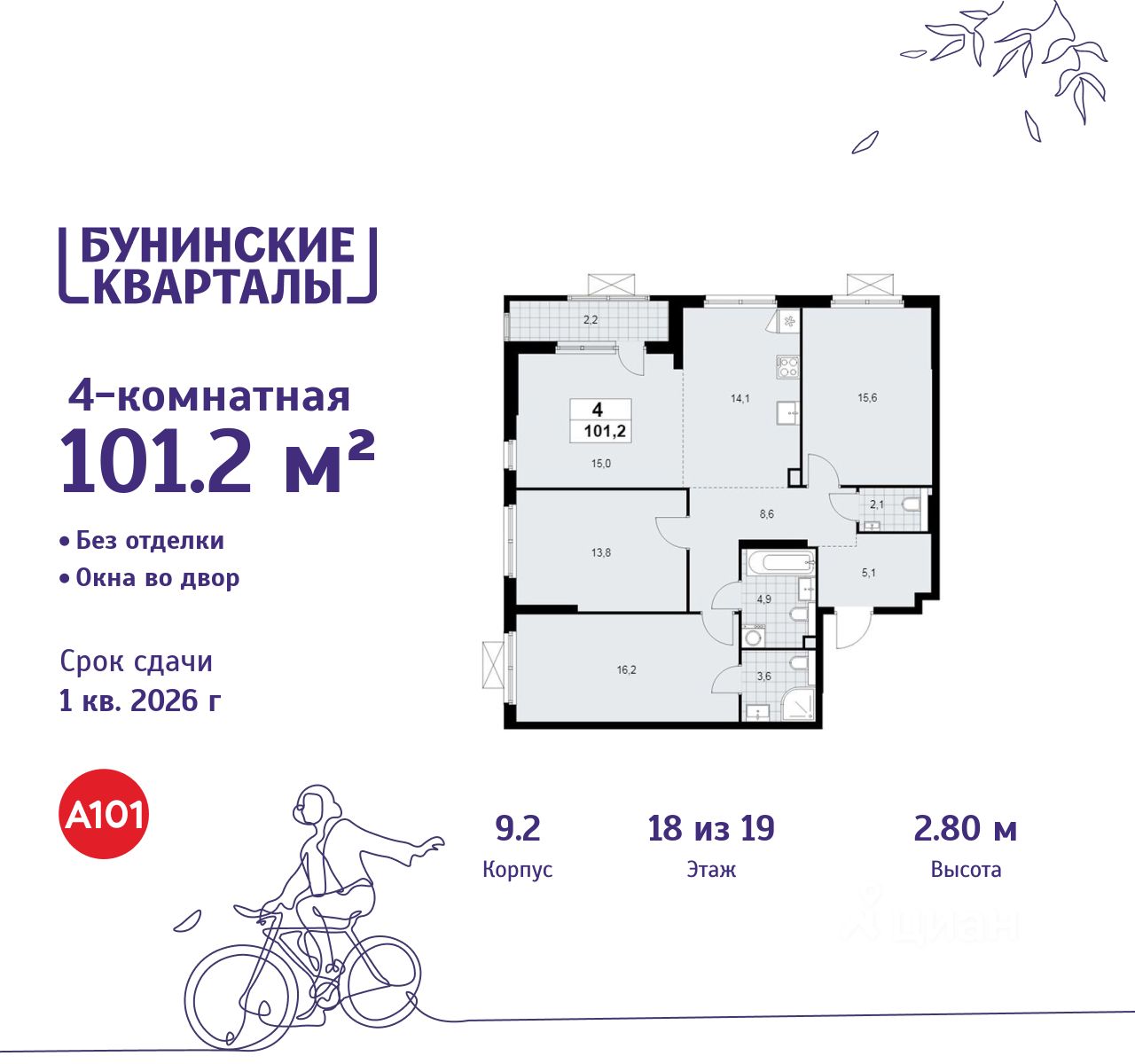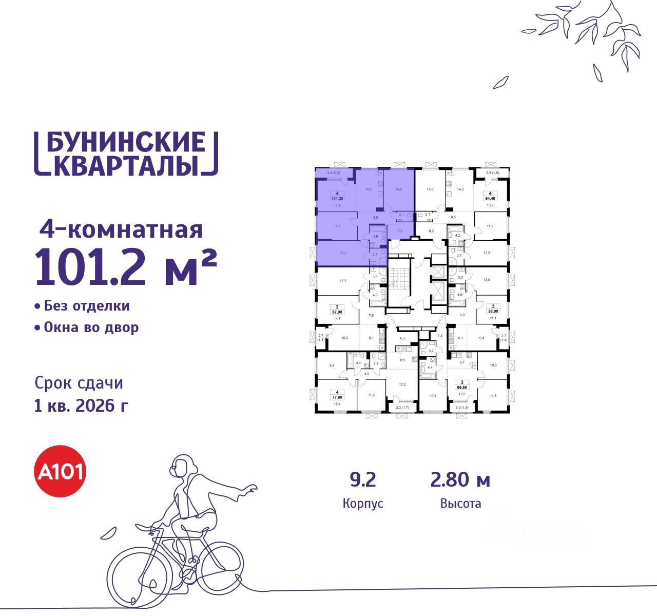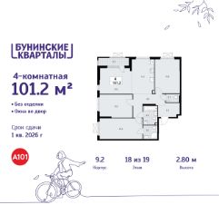 Продается четырехкомнатная квартира 639 в новостройке ЖК "Бунинские кварталы" по адресу Москва, ТиНАО, Новомосковский АО, Сосенское С/П, жилой комплекс Бунинские Кварталы, 9.2, район Коммунарка, Новомосковский административный округ, Москва. Общая площадь квартиры - 101.20 кв. м., этаж 18 из 19, секция 8. Тип проекта, по которому построен дом - монолит, компания-застройщик - ООО "А101". Стоимость квартиры - 30013896 Р. Срок сдачи - 1 квартал 2026.
